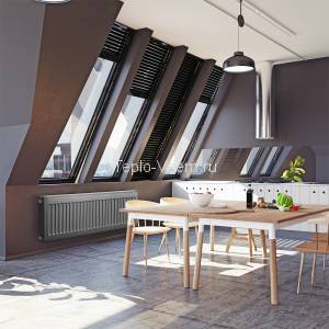 Панельные радиаторы Royal Thermo Ventil Compact с профилированными греющими панелями и конвекционными элементами имеют боковые панели и верхнюю декоративную решетку. Модель имеет 4 присоединительных отверстия по бокам радиатора и 2 снизу с внутренней резьбой G 1/2”